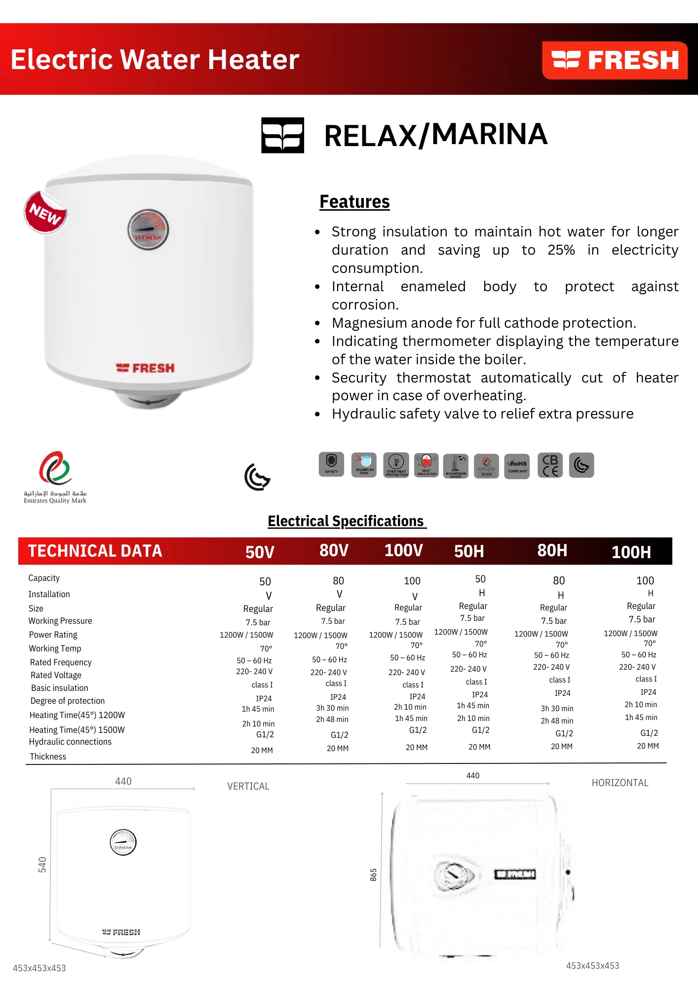 The Fresh Relax/Marina Electric Water Heater is engineered for efficiency, safety, and durability. Designed with advanced thermal insulation, it reduces energy consumption by up to 25% while maintaining water temperature for extended periods. The tank is internally enameled to prevent corrosion and features a magnesium anode for full cathode protection.